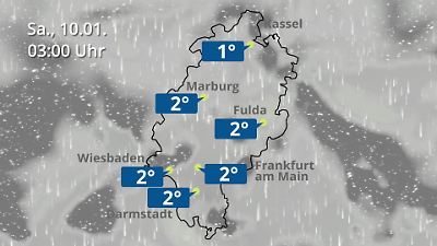 Diese Animation zeigt einen Wetterbericht für Hessen. Prognose vom 09. Januar 2026 um 18:10 Uhr
