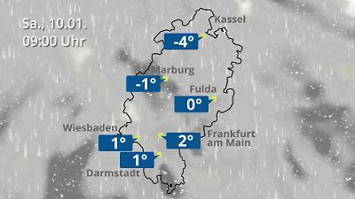 Diese Animation zeigt einen Wetterbericht für Hessen. Prognose vom 10. Januar 2026 um 00:10 Uhr