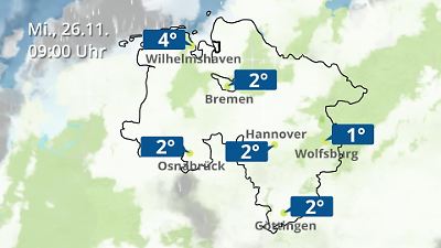 Diese Animation zeigt einen Wetterbericht für Bremen und Niedersachsen. Prognose vom 26. November 2025 um 00:10 Uhr