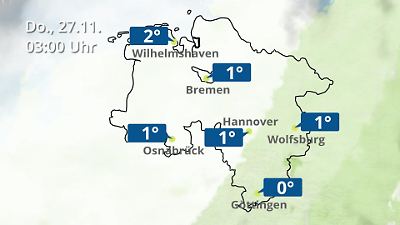 Diese Animation zeigt einen Wetterbericht für Bremen und Niedersachsen. Prognose vom 26. November 2025 um 18:10 Uhr