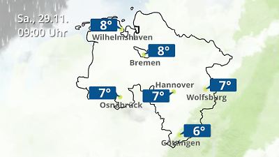 Diese Animation zeigt einen Wetterbericht für Bremen und Niedersachsen. Prognose vom 29. November 2025 um 00:10 Uhr