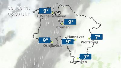 Regen- und Wolkenfilm für Hannover, Osnabrück und WolfsburgBremen und Niedersachsen: Wie wird das Wetter?