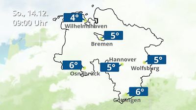Diese Animation zeigt einen Wetterbericht für Bremen und Niedersachsen. Prognose vom 14. Dezember 2025 um 00:10 Uhr