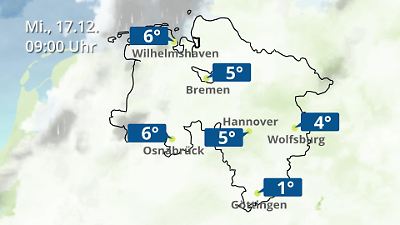 Diese Animation zeigt einen Wetterbericht für Bremen und Niedersachsen. Prognose vom 17. Dezember 2025 um 00:10 Uhr