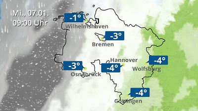 Diese Animation zeigt einen Wetterbericht für Bremen und Niedersachsen. Prognose vom 07. Januar 2026 um 00:10 Uhr