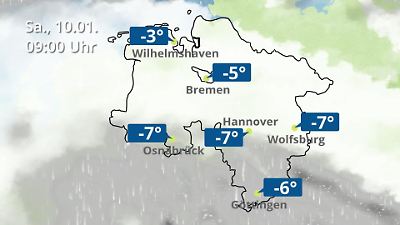 Diese Animation zeigt einen Wetterbericht für Bremen und Niedersachsen. Prognose vom 10. Januar 2026 um 00:10 Uhr