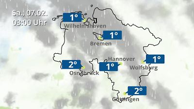 Diese Animation zeigt einen Wetterbericht für Bremen und Niedersachsen. Prognose vom 06. Februar 2026 um 18:10 Uhr