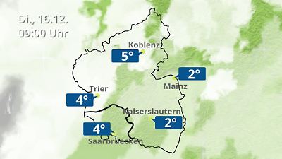 Diese Animation zeigt einen Wetterbericht für Rheinland-Pfalz und das Saarland. Prognose vom 16. Dezember 2025 um 00:10 Uhr
