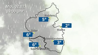 Diese Animation zeigt einen Wetterbericht für Rheinland-Pfalz und das Saarland. Prognose vom 01. Februar 2026 um 18:10 Uhr