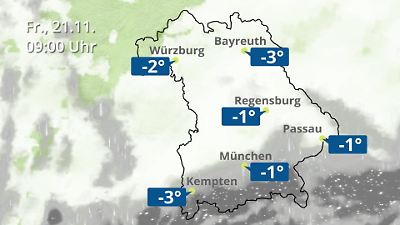 Das Video zeigt die Wettervorhersage für Bayern: Wie warm wird es? Wo scheint die Sonne? Wie dicht ist die Bewölkung? Wann regnet es? Wo schneit es? Wolken und Niederschlag werden gemäß aktueller Wetterprognose als Animation dargestellt. Für die Städte München, Bayreuth, Kempten, Passau, Regensburg und Würzburg wird die Temperatur angezeigt. Prognose vom 21. November 2025 um 00:10 Uhr