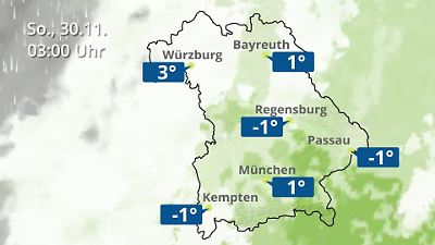 Das Video zeigt die Wettervorhersage für Bayern: Wie warm wird es? Wo scheint die Sonne? Wie dicht ist die Bewölkung? Wann regnet es? Wo schneit es? Wolken und Niederschlag werden gemäß aktueller Wetterprognose als Animation dargestellt. Für die Städte München, Bayreuth, Kempten, Passau, Regensburg und Würzburg wird die Temperatur angezeigt. Prognose vom 29. November 2025 um 18:10 Uhr