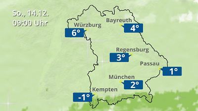 Das Video zeigt die Wettervorhersage für Bayern: Wie warm wird es? Wo scheint die Sonne? Wie dicht ist die Bewölkung? Wann regnet es? Wo schneit es? Wolken und Niederschlag werden gemäß aktueller Wetterprognose als Animation dargestellt. Für die Städte München, Bayreuth, Kempten, Passau, Regensburg und Würzburg wird die Temperatur angezeigt. Prognose vom 14. Dezember 2025 um 00:10 Uhr