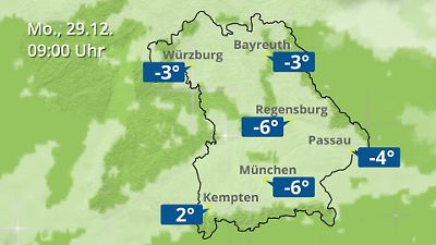 Das Video zeigt die Wettervorhersage für Bayern: Wie warm wird es? Wo scheint die Sonne? Wie dicht ist die Bewölkung? Wann regnet es? Wo schneit es? Wolken und Niederschlag werden gemäß aktueller Wetterprognose als Animation dargestellt. Für die Städte München, Bayreuth, Kempten, Passau, Regensburg und Würzburg wird die Temperatur angezeigt. Prognose vom 29. Dezember 2025 um 00:10 Uhr