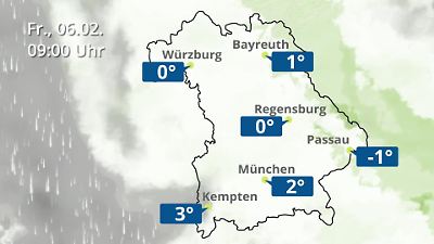 Das Video zeigt die Wettervorhersage für Bayern: Wie warm wird es? Wo scheint die Sonne? Wie dicht ist die Bewölkung? Wann regnet es? Wo schneit es? Wolken und Niederschlag werden gemäß aktueller Wetterprognose als Animation dargestellt. Für die Städte München, Bayreuth, Kempten, Passau, Regensburg und Würzburg wird die Temperatur angezeigt. Prognose vom 06. Februar 2026 um 00:10 Uhr