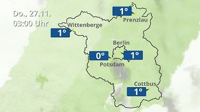 Dieses Video zeigt einen Wetterbericht für Berlin und Brandenburg. Die Animation zeigt Wolken, Regen und Schnee je nach aktueller Prognose. Für Berlin, Cottbus, Potsdam, Prenzlau und Wittenberge werden die erwarteten Temperaturen angezeigt. Prognose vom 26. November 2025 um 18:10 Uhr