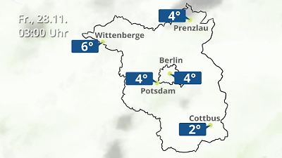 Dieses Video zeigt einen Wetterbericht für Berlin und Brandenburg. Die Animation zeigt Wolken, Regen und Schnee je nach aktueller Prognose. Für Berlin, Cottbus, Potsdam, Prenzlau und Wittenberge werden die erwarteten Temperaturen angezeigt. Prognose vom 27. November 2025 um 18:10 Uhr