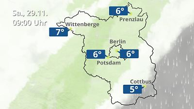 Dieses Video zeigt einen Wetterbericht für Berlin und Brandenburg. Die Animation zeigt Wolken, Regen und Schnee je nach aktueller Prognose. Für Berlin, Cottbus, Potsdam, Prenzlau und Wittenberge werden die erwarteten Temperaturen angezeigt. Prognose vom 29. November 2025 um 00:10 Uhr
