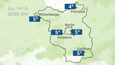 Dieses Video zeigt einen Wetterbericht für Berlin und Brandenburg. Die Animation zeigt Wolken, Regen und Schnee je nach aktueller Prognose. Für Berlin, Cottbus, Potsdam, Prenzlau und Wittenberge werden die erwarteten Temperaturen angezeigt. Prognose vom 13. Dezember 2025 um 18:10 Uhr
