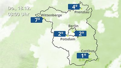 Dieses Video zeigt einen Wetterbericht für Berlin und Brandenburg. Die Animation zeigt Wolken, Regen und Schnee je nach aktueller Prognose. Für Berlin, Cottbus, Potsdam, Prenzlau und Wittenberge werden die erwarteten Temperaturen angezeigt. Prognose vom 17. Dezember 2025 um 18:10 Uhr