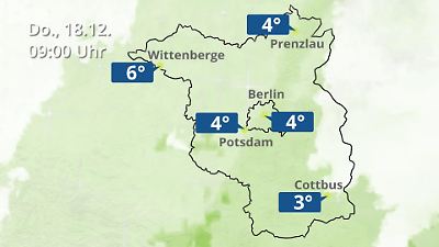 Dieses Video zeigt einen Wetterbericht für Berlin und Brandenburg. Die Animation zeigt Wolken, Regen und Schnee je nach aktueller Prognose. Für Berlin, Cottbus, Potsdam, Prenzlau und Wittenberge werden die erwarteten Temperaturen angezeigt. Prognose vom 18. Dezember 2025 um 00:10 Uhr