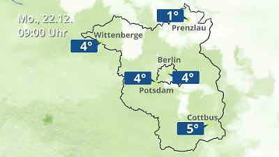 Dieses Video zeigt einen Wetterbericht für Berlin und Brandenburg. Die Animation zeigt Wolken, Regen und Schnee je nach aktueller Prognose. Für Berlin, Cottbus, Potsdam, Prenzlau und Wittenberge werden die erwarteten Temperaturen angezeigt. Prognose vom 22. Dezember 2025 um 00:10 Uhr