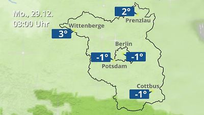 Dieses Video zeigt einen Wetterbericht für Berlin und Brandenburg. Die Animation zeigt Wolken, Regen und Schnee je nach aktueller Prognose. Für Berlin, Cottbus, Potsdam, Prenzlau und Wittenberge werden die erwarteten Temperaturen angezeigt. Prognose vom 28. Dezember 2025 um 18:10 Uhr