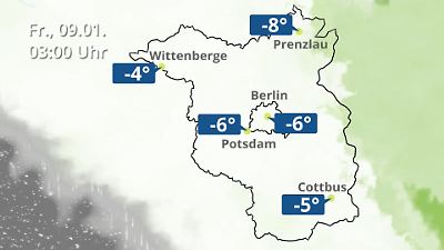 Dieses Video zeigt einen Wetterbericht für Berlin und Brandenburg. Die Animation zeigt Wolken, Regen und Schnee je nach aktueller Prognose. Für Berlin, Cottbus, Potsdam, Prenzlau und Wittenberge werden die erwarteten Temperaturen angezeigt. Prognose vom 08. Januar 2026 um 18:10 Uhr