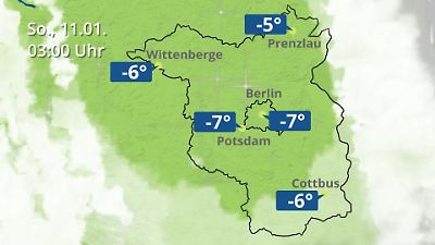 Dieses Video zeigt einen Wetterbericht für Berlin und Brandenburg. Die Animation zeigt Wolken, Regen und Schnee je nach aktueller Prognose. Für Berlin, Cottbus, Potsdam, Prenzlau und Wittenberge werden die erwarteten Temperaturen angezeigt. Prognose vom 10. Januar 2026 um 18:10 Uhr