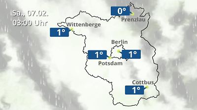 Dieses Video zeigt einen Wetterbericht für Berlin und Brandenburg. Die Animation zeigt Wolken, Regen und Schnee je nach aktueller Prognose. Für Berlin, Cottbus, Potsdam, Prenzlau und Wittenberge werden die erwarteten Temperaturen angezeigt. Prognose vom 06. Februar 2026 um 18:10 Uhr