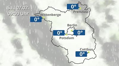 Dieses Video zeigt einen Wetterbericht für Berlin und Brandenburg. Die Animation zeigt Wolken, Regen und Schnee je nach aktueller Prognose. Für Berlin, Cottbus, Potsdam, Prenzlau und Wittenberge werden die erwarteten Temperaturen angezeigt. Prognose vom 07. Februar 2026 um 00:10 Uhr