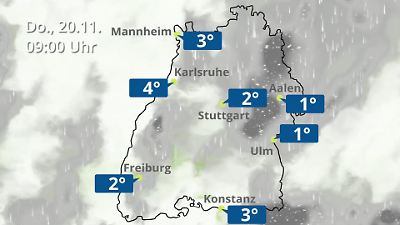 Wie ist das Wetter in Süddeutschland heute? Wie wird das Wetter im Schwarzwald morgen? Dieses Video zeigt den Regen- und Wolkenfilm für Baden-Württemberg für 36 Stunden. Mit dieser Vorschau können Sie sehen, wo es nach aktueller Wetterprognose regnen oder schneien wird, bzw. wo die Sonne scheint. Für die Städte Aalen, Freiburg, Karlsruhe, Konstanz, Mannheim, Stuttgart und Ulm werden die Temperaturen nach Prognose in Grad Celsius angezeigt. Daran können Sie erkennen, wie warm es in Baden-Württemberg am Tag, bzw. wie kalt es in der Nacht wird. Prognose vom 20. November 2025 um 00:10 Uhr