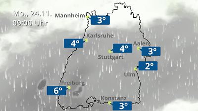 Wie ist das Wetter in Süddeutschland heute? Wie wird das Wetter im Schwarzwald morgen? Dieses Video zeigt den Regen- und Wolkenfilm für Baden-Württemberg für 36 Stunden. Mit dieser Vorschau können Sie sehen, wo es nach aktueller Wetterprognose regnen oder schneien wird, bzw. wo die Sonne scheint. Für die Städte Aalen, Freiburg, Karlsruhe, Konstanz, Mannheim, Stuttgart und Ulm werden die Temperaturen nach Prognose in Grad Celsius angezeigt. Daran können Sie erkennen, wie warm es in Baden-Württemberg am Tag, bzw. wie kalt es in der Nacht wird. Prognose vom 24. November 2025 um 00:10 Uhr