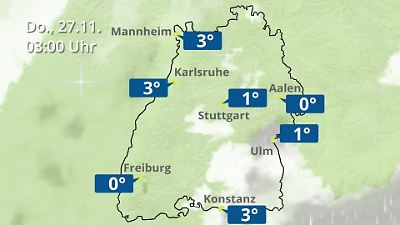 Wie ist das Wetter in Süddeutschland heute? Wie wird das Wetter im Schwarzwald morgen? Dieses Video zeigt den Regen- und Wolkenfilm für Baden-Württemberg für 36 Stunden. Mit dieser Vorschau können Sie sehen, wo es nach aktueller Wetterprognose regnen oder schneien wird, bzw. wo die Sonne scheint. Für die Städte Aalen, Freiburg, Karlsruhe, Konstanz, Mannheim, Stuttgart und Ulm werden die Temperaturen nach Prognose in Grad Celsius angezeigt. Daran können Sie erkennen, wie warm es in Baden-Württemberg am Tag, bzw. wie kalt es in der Nacht wird. Prognose vom 26. November 2025 um 18:10 Uhr