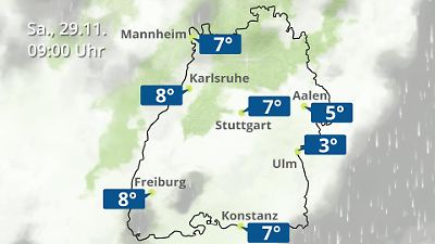 Wie ist das Wetter in Süddeutschland heute? Wie wird das Wetter im Schwarzwald morgen? Dieses Video zeigt den Regen- und Wolkenfilm für Baden-Württemberg für 36 Stunden. Mit dieser Vorschau können Sie sehen, wo es nach aktueller Wetterprognose regnen oder schneien wird, bzw. wo die Sonne scheint. Für die Städte Aalen, Freiburg, Karlsruhe, Konstanz, Mannheim, Stuttgart und Ulm werden die Temperaturen nach Prognose in Grad Celsius angezeigt. Daran können Sie erkennen, wie warm es in Baden-Württemberg am Tag, bzw. wie kalt es in der Nacht wird. Prognose vom 29. November 2025 um 00:10 Uhr
