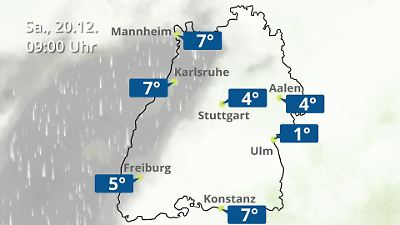 Wie ist das Wetter in Süddeutschland heute? Wie wird das Wetter im Schwarzwald morgen? Dieses Video zeigt den Regen- und Wolkenfilm für Baden-Württemberg für 36 Stunden. Mit dieser Vorschau können Sie sehen, wo es nach aktueller Wetterprognose regnen oder schneien wird, bzw. wo die Sonne scheint. Für die Städte Aalen, Freiburg, Karlsruhe, Konstanz, Mannheim, Stuttgart und Ulm werden die Temperaturen nach Prognose in Grad Celsius angezeigt. Daran können Sie erkennen, wie warm es in Baden-Württemberg am Tag, bzw. wie kalt es in der Nacht wird. Prognose vom 20. Dezember 2025 um 00:10 Uhr