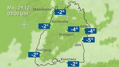 Wie ist das Wetter in Süddeutschland heute? Wie wird das Wetter im Schwarzwald morgen? Dieses Video zeigt den Regen- und Wolkenfilm für Baden-Württemberg für 36 Stunden. Mit dieser Vorschau können Sie sehen, wo es nach aktueller Wetterprognose regnen oder schneien wird, bzw. wo die Sonne scheint. Für die Städte Aalen, Freiburg, Karlsruhe, Konstanz, Mannheim, Stuttgart und Ulm werden die Temperaturen nach Prognose in Grad Celsius angezeigt. Daran können Sie erkennen, wie warm es in Baden-Württemberg am Tag, bzw. wie kalt es in der Nacht wird. Prognose vom 28. Dezember 2025 um 18:10 Uhr