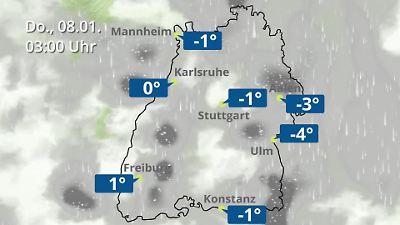 Wie ist das Wetter in Süddeutschland heute? Wie wird das Wetter im Schwarzwald morgen? Dieses Video zeigt den Regen- und Wolkenfilm für Baden-Württemberg für 36 Stunden. Mit dieser Vorschau können Sie sehen, wo es nach aktueller Wetterprognose regnen oder schneien wird, bzw. wo die Sonne scheint. Für die Städte Aalen, Freiburg, Karlsruhe, Konstanz, Mannheim, Stuttgart und Ulm werden die Temperaturen nach Prognose in Grad Celsius angezeigt. Daran können Sie erkennen, wie warm es in Baden-Württemberg am Tag, bzw. wie kalt es in der Nacht wird. Prognose vom 07. Januar 2026 um 18:10 Uhr