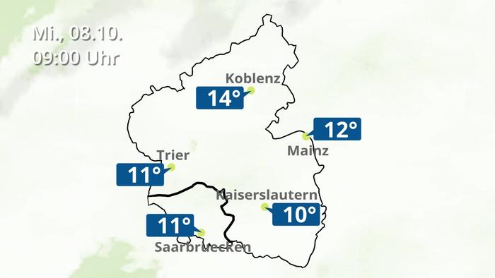 Diese Animation zeigt einen Wetterbericht für Rheinland-Pfalz und das Saarland. Prognose vom 08. Oktober 2025 um 00:10 Uhr
