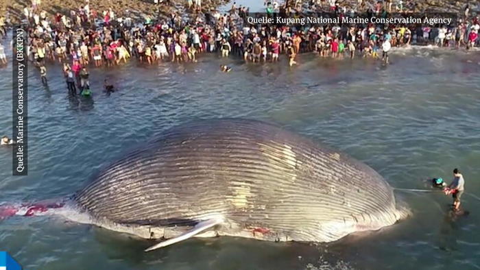 In Indonesien wurde ein toter Blauwahl mit 100 Tonnen Gewicht tot am Strand gefunden.