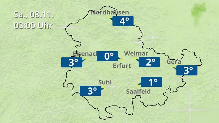 Diese Animation zeigt einen Wetterbericht für Thüringen. Prognose vom 07. November 2025 um 18:10 Uhr