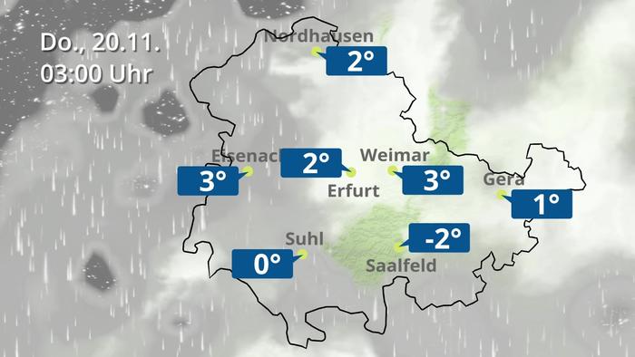 Diese Animation zeigt einen Wetterbericht für Thüringen. Prognose vom 19. November 2025 um 18:10 Uhr