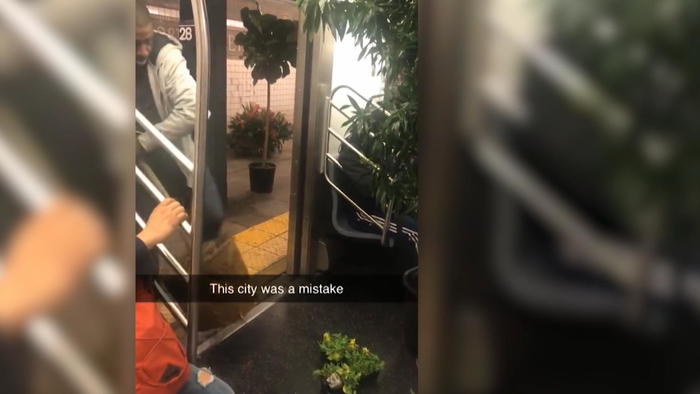 Dieser New Yorker U-Bahnfahrer packt mal eben die ganze Bahn voll - mit riesigen Pflanzen.