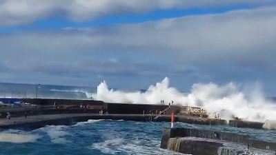 Amateuraufnahmen zeigen den Moment, als die riesige Welle auf die Mole prallt. Eine 79-jährige Urlauberin aus den Niederlanden kommt ums Leben. An drei Orten verlieren am Samstag auf Teneriffa insgesamt drei Menschen ihr Leben durch hohe Wellen. Die Gemeindeverwaltung von Puerto de la Cruz sagt zwar, es habe Warnhinweise gegeben. Warum dennoch Menschen auf der Mole waren, ist unklar.