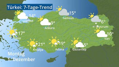 Das Video zeigt die Vorschau für das Wetter in der Türkei: Wie warm wird es? Gibt es Regen, Gewitter oder Schnee? Innerhalb der Türkei kann sich das Wetter erheblich unterscheiden. Für die Städte Ankara, Istanbul, Izmir, Antalya, Adana, Gaziantep, Van, Erzurum und Samsun wird die aktuelle Wetterprognose als Symbol mit Temperatur angezeigt. Prognose vom 29. November 2025 um 02:30 Uhr