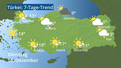 Das Video zeigt die Vorschau für das Wetter in der Türkei: Wie warm wird es? Gibt es Regen, Gewitter oder Schnee? Innerhalb der Türkei kann sich das Wetter erheblich unterscheiden. Für die Städte Ankara, Istanbul, Izmir, Antalya, Adana, Gaziantep, Van, Erzurum und Samsun wird die aktuelle Wetterprognose als Symbol mit Temperatur angezeigt. Prognose vom 14. Dezember 2025 um 02:30 Uhr