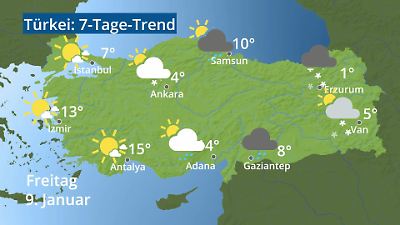 Das Video zeigt die Vorschau für das Wetter in der Türkei: Wie warm wird es? Gibt es Regen, Gewitter oder Schnee? Innerhalb der Türkei kann sich das Wetter erheblich unterscheiden. Für die Städte Ankara, Istanbul, Izmir, Antalya, Adana, Gaziantep, Van, Erzurum und Samsun wird die aktuelle Wetterprognose als Symbol mit Temperatur angezeigt. Prognose vom 07. Januar 2026 um 02:30 Uhr