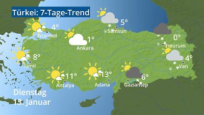 Das Video zeigt die Vorschau für das Wetter in der Türkei: Wie warm wird es? Gibt es Regen, Gewitter oder Schnee? Innerhalb der Türkei kann sich das Wetter erheblich unterscheiden. Für die Städte Ankara, Istanbul, Izmir, Antalya, Adana, Gaziantep, Van, Erzurum und Samsun wird die aktuelle Wetterprognose als Symbol mit Temperatur angezeigt. Prognose vom 11. Januar 2026 um 02:30 Uhr