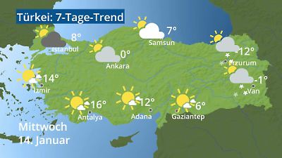 Das Video zeigt die Vorschau für das Wetter in der Türkei: Wie warm wird es? Gibt es Regen, Gewitter oder Schnee? Innerhalb der Türkei kann sich das Wetter erheblich unterscheiden. Für die Städte Ankara, Istanbul, Izmir, Antalya, Adana, Gaziantep, Van, Erzurum und Samsun wird die aktuelle Wetterprognose als Symbol mit Temperatur angezeigt. Prognose vom 12. Januar 2026 um 02:30 Uhr