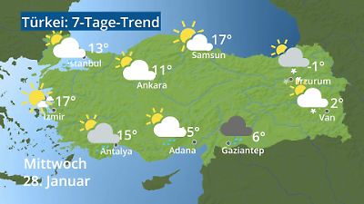 Das Video zeigt die Vorschau für das Wetter in der Türkei: Wie warm wird es? Gibt es Regen, Gewitter oder Schnee? Innerhalb der Türkei kann sich das Wetter erheblich unterscheiden. Für die Städte Ankara, Istanbul, Izmir, Antalya, Adana, Gaziantep, Van, Erzurum und Samsun wird die aktuelle Wetterprognose als Symbol mit Temperatur angezeigt. Prognose vom 26. Januar 2026 um 02:30 Uhr
