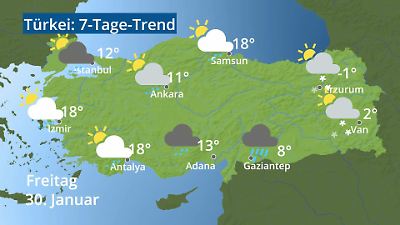 Das Video zeigt die Vorschau für das Wetter in der Türkei: Wie warm wird es? Gibt es Regen, Gewitter oder Schnee? Innerhalb der Türkei kann sich das Wetter erheblich unterscheiden. Für die Städte Ankara, Istanbul, Izmir, Antalya, Adana, Gaziantep, Van, Erzurum und Samsun wird die aktuelle Wetterprognose als Symbol mit Temperatur angezeigt. Prognose vom 28. Januar 2026 um 02:30 Uhr